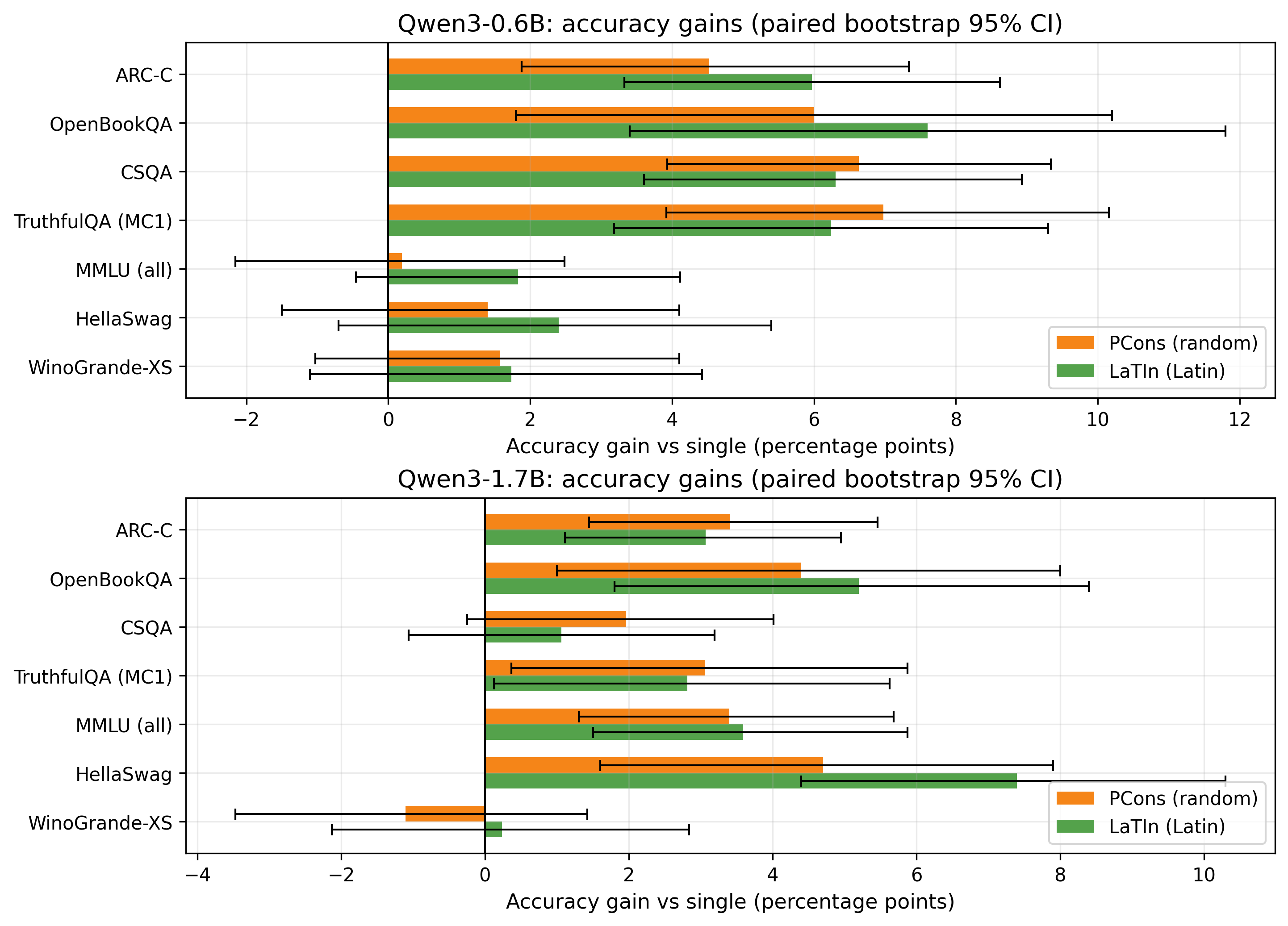 | Qwen/Qwen3-1.7B | HellaSwag | +7.4 pp | LaTIn |
